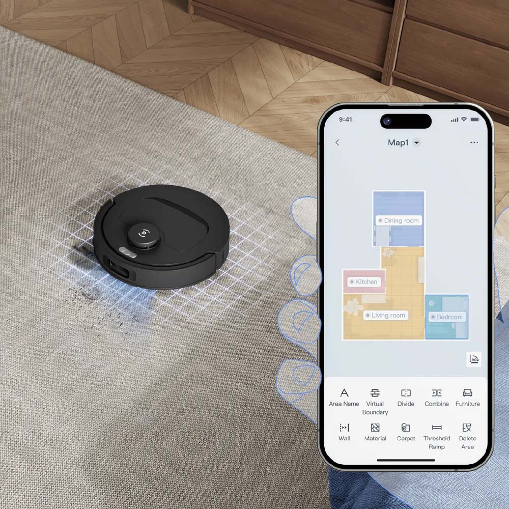 - مسیریابی هوشمند (Path Planning): بهترین مسیر نظافت را بهطور خودکار انتخاب میکند و حتی در محیطهای پیچیده مثل زیر میز غذاخوری بدون گیر کردن حرکت میکند.