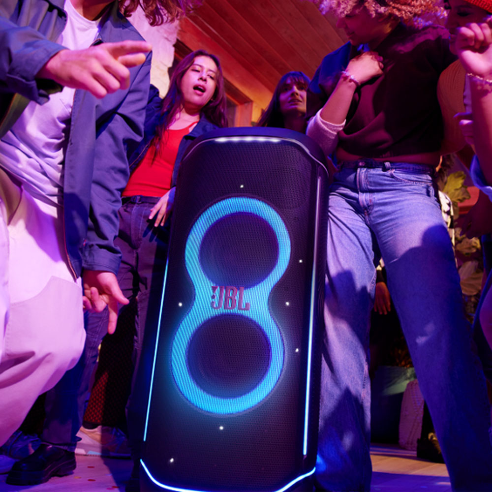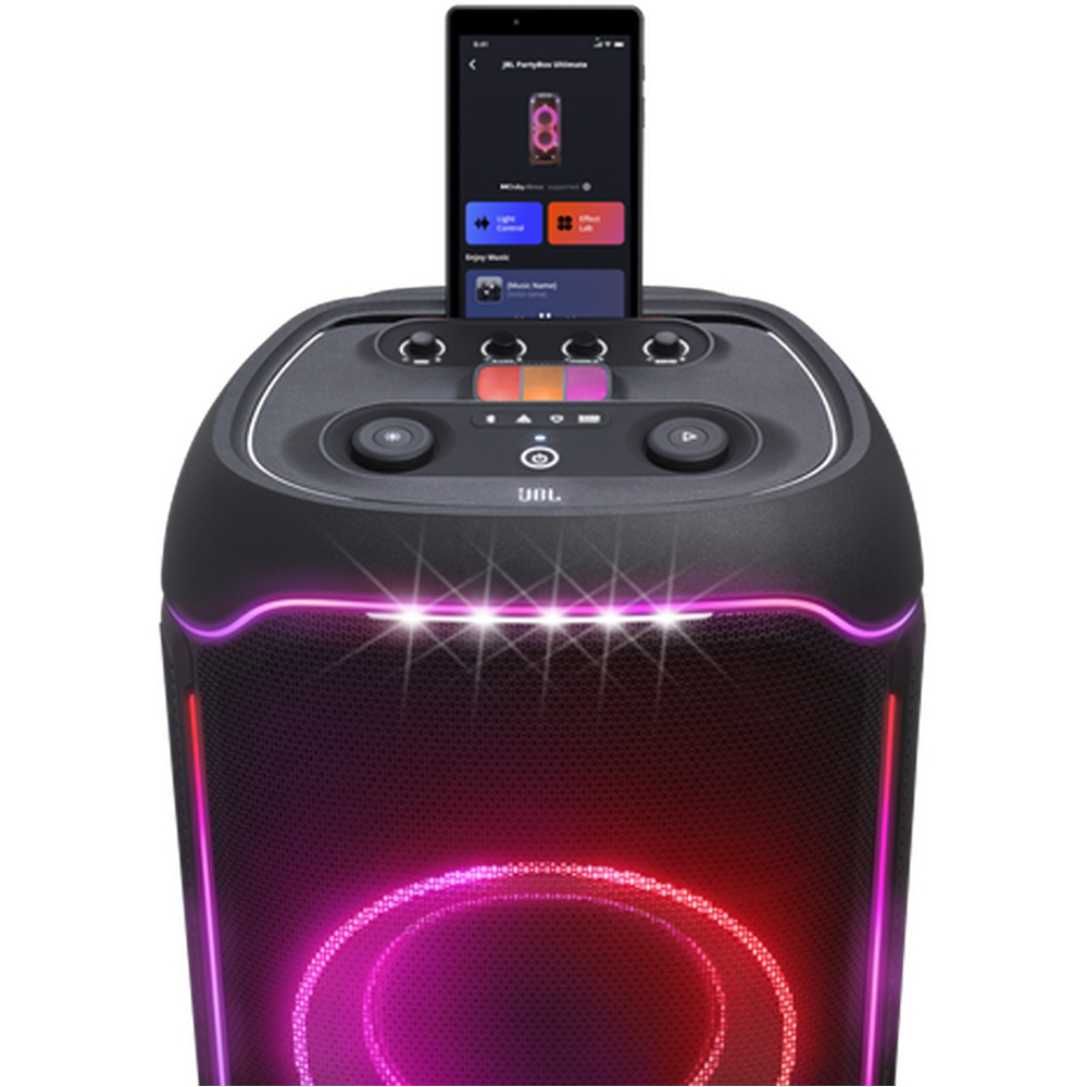 نمایش نور چندبعدی یکی دیگر از نقاط قوت JBL PartyBox Ultimate است. جلوههای نورانی شامل ستارهای، خطوط نورانی، پروژکتور و استروب، با ضربان موسیقی هماهنگ می&zwnشوند و حتی سطح زیر اسپیکر را روشن میکنند. کنترل نور از طریق پنل بالایی یا اپلیکیشن JBL One امکانپذیر است و کاربر میتواند رنگها، الگوها و سرعت حرکت نور را شخصیسازی کند. این قابلیت برای جشنها، مراسم تولد و اجراهای خیابانی، فضایی حرفهای و جذاب ایجاد می&zwnکند.